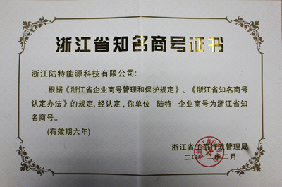 1、2012年3月,經(jīng)浙江省知名商號(hào)評(píng)審委員會(huì)評(píng)審,浙江陸特能源科技有限公司的“陸特”商號(hào)被省工商局認(rèn)定為浙江省知名商號(hào),將受到六年的保護(hù)。同期被評(píng)定為知名商號(hào)的還包括了“萬(wàn)向集團(tuán)”、“娃哈哈集團(tuán)”、“華立集團(tuán)”等知名企業(yè)。